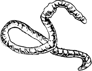 На рисунке показан дождевой червь. Он относится к типу Кольчатые черви. Это трёхслойное животное (есть экто- энто- и мезодерма) с двусторонней симметрией тела. Полость тела вторичная (целом), заполнена жидкостью. Органы движения — параподии и щетинки.