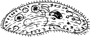 На картинке изображена инфузория туфелька. Её можно определить по наличию ресничек, сократительных вакуолей и двух ядер - большого и малого. У инфузории есть также порошица, через которую она удаляет непереваренные остатки пищи. Инфузории делятся путём митоза, а также у них есть половой процесс - конъюгация.