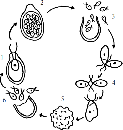 Половым путём взрослая гаплоидная хламидомонада (1) размножается при наступлении неблагоприятных условий (похолодание, пересыхание водоёма). В этом случае внутри хламидомонады возникают половые клетки (2) — гаметы (до 32 гамет). Гаметы разных хламидомонад выходят в воду (3) и соединяются попарно (4), образуя зиготу (зигоспору), которая покрывается толстой оболочкой (5). В состоянии зиготы хламидомонада пережидает неблагоприятные условия. Зигота - это спорофит. При наступлении благоприятных условий зигота (2n) делится мейозом и образуется 4 новые клетки – молодые хламидомонады (6).