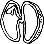 На рисунке показано семя двудольного растения. Для двудольных растений характерно кольцо камбия в стебле, кольцевое строение проводящей системы и две семядоли в зародыше семени. Мочковатая корневая система и отсутствие роста стебля в толщину характерно для однодольных растений, а споры в спорангиях характерны для споровых, а не семенных.