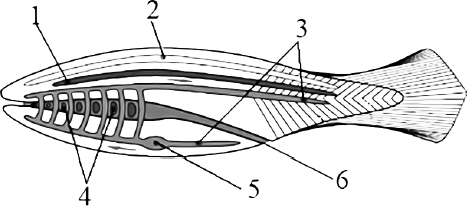 Внутренний скелет. Скелет представлен хордой (цифра 1), которая имеет вид эластичного тяжа.