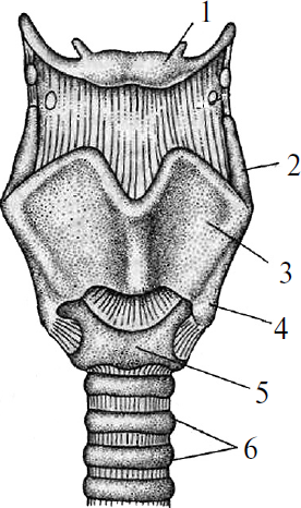 На рисунке следующие обозначения: 1 – подъязычная кость, 2 – верхний рог щитовидного хряща, 3 – щитовидный хрящ, 4 – нижний рог щитовидного хряща, 5 – перстневидный хрящ, 6 – хрящи трахеи.