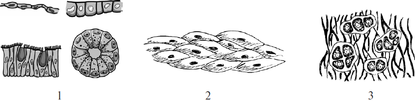 1 - эпителиальные ткани, 2 - гладкая мышечная ткань, 3 - хрящевая соединительная