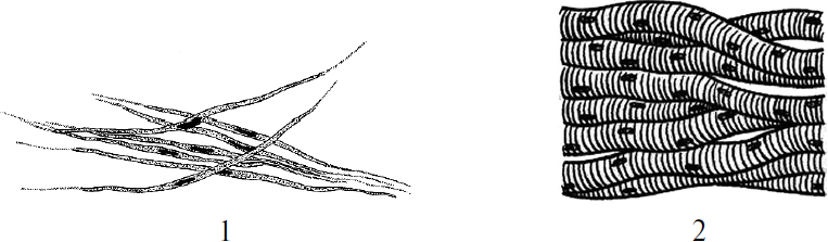 На рисунке 1 – гладкая мышечная ткань, 2 – поперечнополосатая. Гладкие мышцы образуют мышечный слой стенок желудка, кишечника, мочеточников, бронхов, кровеносных сосудов и других полых органов. Они состоят из веретенообразных мышечных волокон и не имеют поперечной исчерченности, так как миофибриллы в них расположены менее упорядоченно. В гладких мышцах отдельные клетки соединяются между собой специальными участками наружных мембран - нексусами. За счет этих контактов потенциалы действия распространяются с одного мышечного волокна на другое. Поэтому в реакцию возбуждения быстро вовлекается вся мышца. Характерной особенностью гладких мышц является их способность к спонтанной автоматической деятельности (мышцы желудка, кишечника, желчного пузыря, мочеточников). Это свойство регулируется нервными окончаниями. Поперечнополосатые мышцы располагаются на костях скелета и сокращением приводят в движение отдельные суставы и все тело. Скелетные мышцы образуют тело, или сому, поэтому их еще называют соматическими, а иннервирующую их систему — соматической нервной системой. Благодаря деятельности скелетной мускулатуры осуществляется передвижение тела в пространстве, разнообразная работа конечностей, расширение грудной клетки при дыхании, движение головы и позвоночника, жевание, мимика лица.