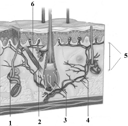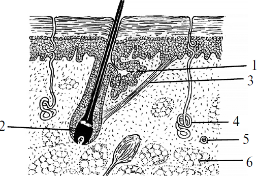На рисунке изображен разрез кожи, на котором следующие обозначения: 1 – потовая железа, 2 – сальная железа, 3 – волосяной мешочек, 4 – кровеносные сосуды, 5 – дерма, 6 – гладкая мышца.