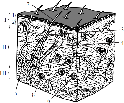I - эпидермис, II - дерма, III - гиподерма. 1 - верхние слои эпидермиса, 2 - базальный слой эпидермиса и сосочковый слой дермы, вдающийся в эпидермис, 3 - сальная железа, 4 - мышца, поднимающая волос, 5 - потовая железа, 6 и 8 - нервные рецепторы, 7 - волос