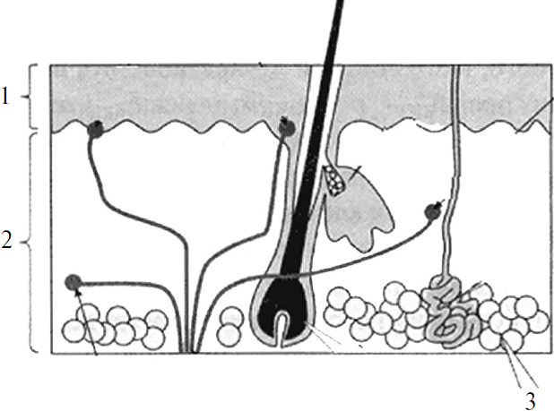 Цифрой 1 обозначен эпидермис, 2 - дерма, 3 – подкожно-жировая клетчатка. Эпидермис — наружный слой кожи, состоящий из кератиноцитов, или эпидермальных клеток. Под эпидермисом располагается дерма, в состав которой входят коллаген и придатки кожи (волосяные фолликулы, сальные железы, апокринные и экзокринные железы). В дерме также находится большое количество кровеносных и лимфатических сосудов и нервов. Под дермой располагается гиподерма, состоящая из жировой ткани, крупных кровеносных сосудов и нервов; кроме того, в гиподерме находятся основания волосяных фолликулов и потовые железы. Наиболее важные функции эпидермиса — защита от факторов окружающей среды (барьерная функция), предупреждение обезвоживания и иммунный надзор. Роговой слой играет наиболее важную роль в защите от токсинов и обезвоживания. Подкожно-жировая клетчатка состоит из рыхлой соединительной и жировой ткани, выполняет резервную функцию (источник энергии), амортизирующую (смягчает толчки и удары), теплоизолирующую.