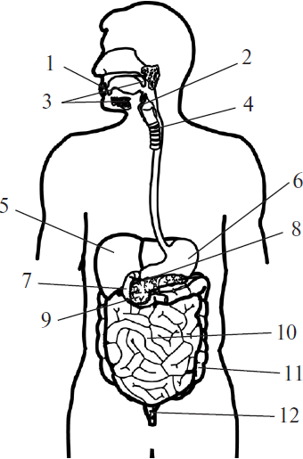 Лизоцим - вещество, входящее в состав слюны, вырабатываемой слюнными железами (3). 1 - преддверие ротовой полости 2 - гортаноглотка 3 - слюнные железы 4 - трахея 5 - печень 6 - желудок 7 - 12-кишка 8 - желчный пузырь 9 - поджелудочная железа 10 - тонкий кишечник 11 - толстая кишка 12 - прямая кишка