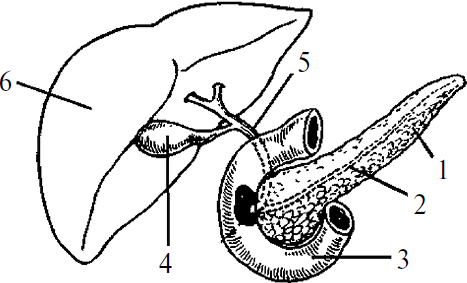 На рисунке следующие обозначения: 1 – поджелудочная железа, 2 – протоки поджелудочной железы, 3 – двенадцатиперстная кишка, 4 – желчный пузырь, 5 – желчный проток, 6 – печень.