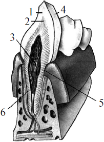 Он имеет следующие части: 1- эмаль, 2 - дентин, 3 – пульпа, 4 – коронка, 5 – десна с прилегающей шейкой, 6 – дентин в области корня.