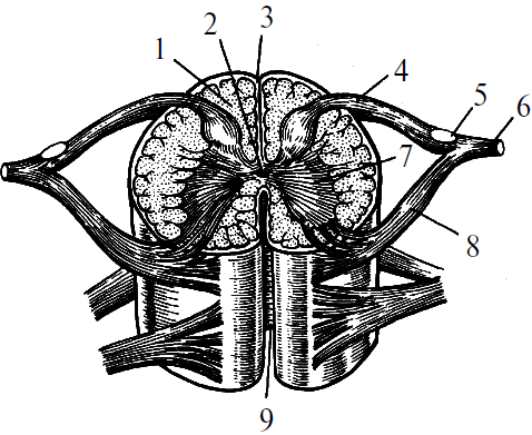 На поперечном разрезе спинного мозга обозначены: 1 – белое вещество, 2 – спинномозговой канал, 3 – задняя продольная борозда, 4 – задний корешок, 5 – ганглий (спинномозговой узел), 6 – спинномозговой нерв, 7 - серое вещество, 8 - передний корешок, 9 – срединная щель.