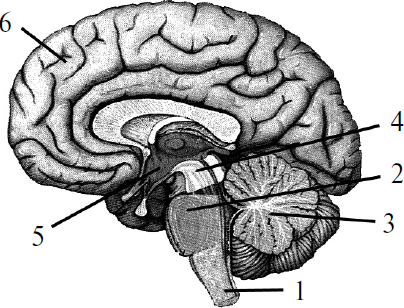 На рисунке продольного разреза мозга следующие обозначения: 1 – продолговатый мозг, 2 – мост, 3 – мозжечок, 4 – средний мозг, 5 – промежуточный мозг, 6 – большие полушария.
