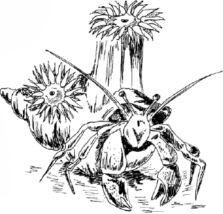 Рак-отшельник и актиния: рак селится в пустой раковине моллюска и возит ее на себе вместе с прикрепленной актинией, маскируя себя и защищая. Актиния медленная, но так у нее больше шансов добыть еду, когда ее перевозят, она доедает пищу за раком.