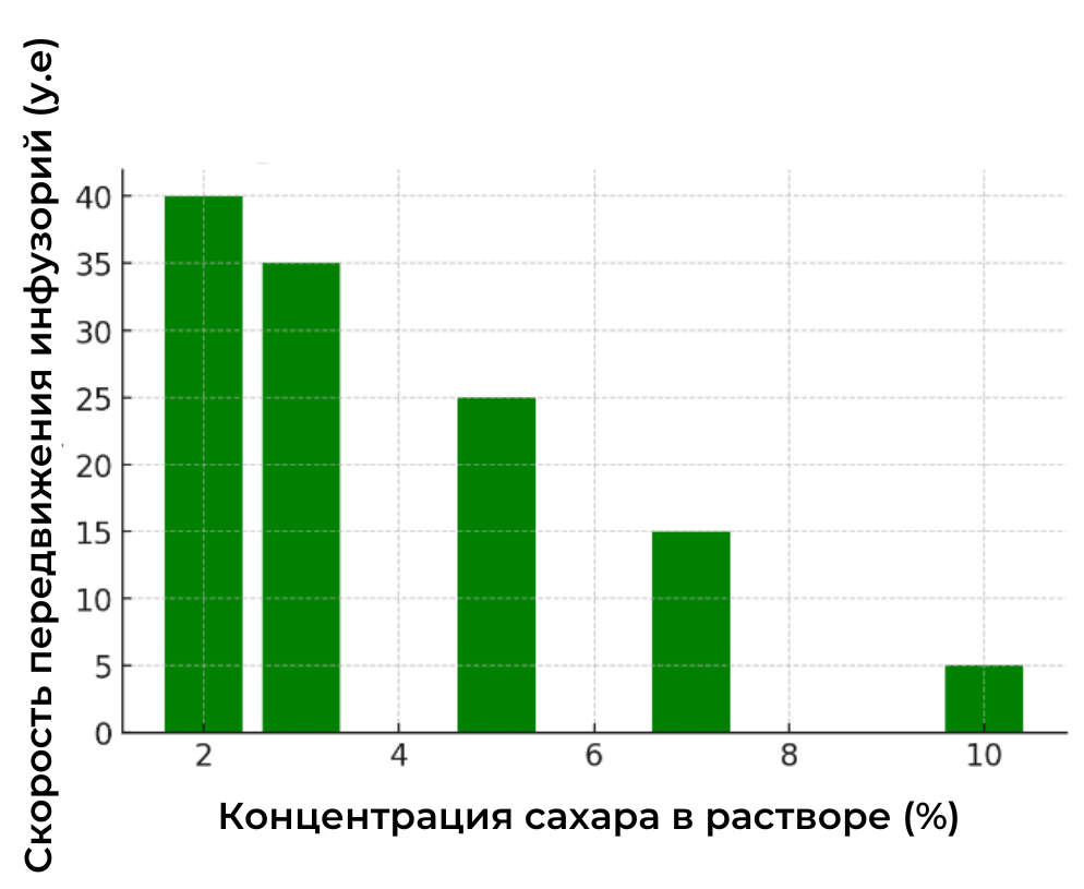 Исследователь изучал влияние концентрации сахара на скорость передвижения инфузорий. Он подготовил растворы сахара с разной концентрацией (2%, 3%, 5%, 7%, 10%) и измерял скорость движения инфузорий через 10 минут после помещения их в каждый раствор. Результаты были нанесены на график.