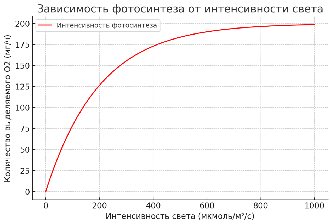Исследователь изучает влияние интенсивности света на процесс фотосинтеза у водорослей. Для этого он помещал водоросли в аквариумы с разной интенсивностью освещения и измерял количество вырабатываемого кислорода. График показывает полученные данные.