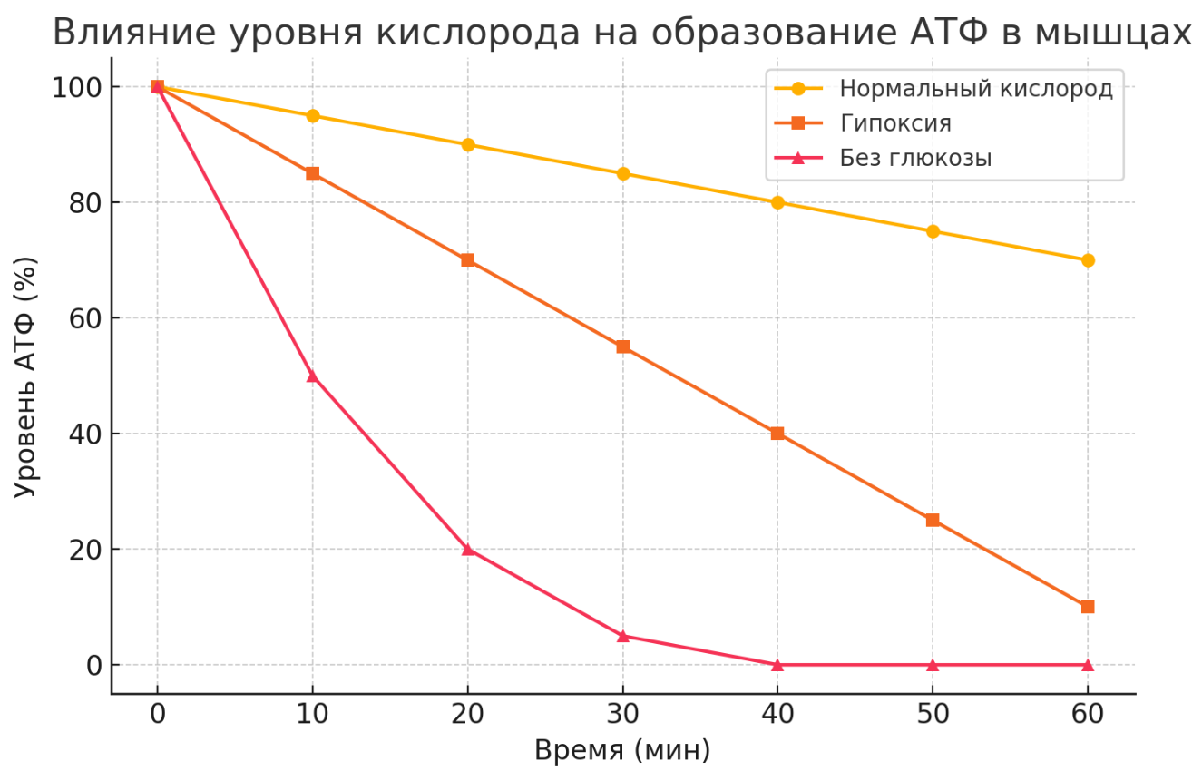 1. отсутствие глюкозы приведёт к прекращению выработки АТФ независимо от уровня кислорода;