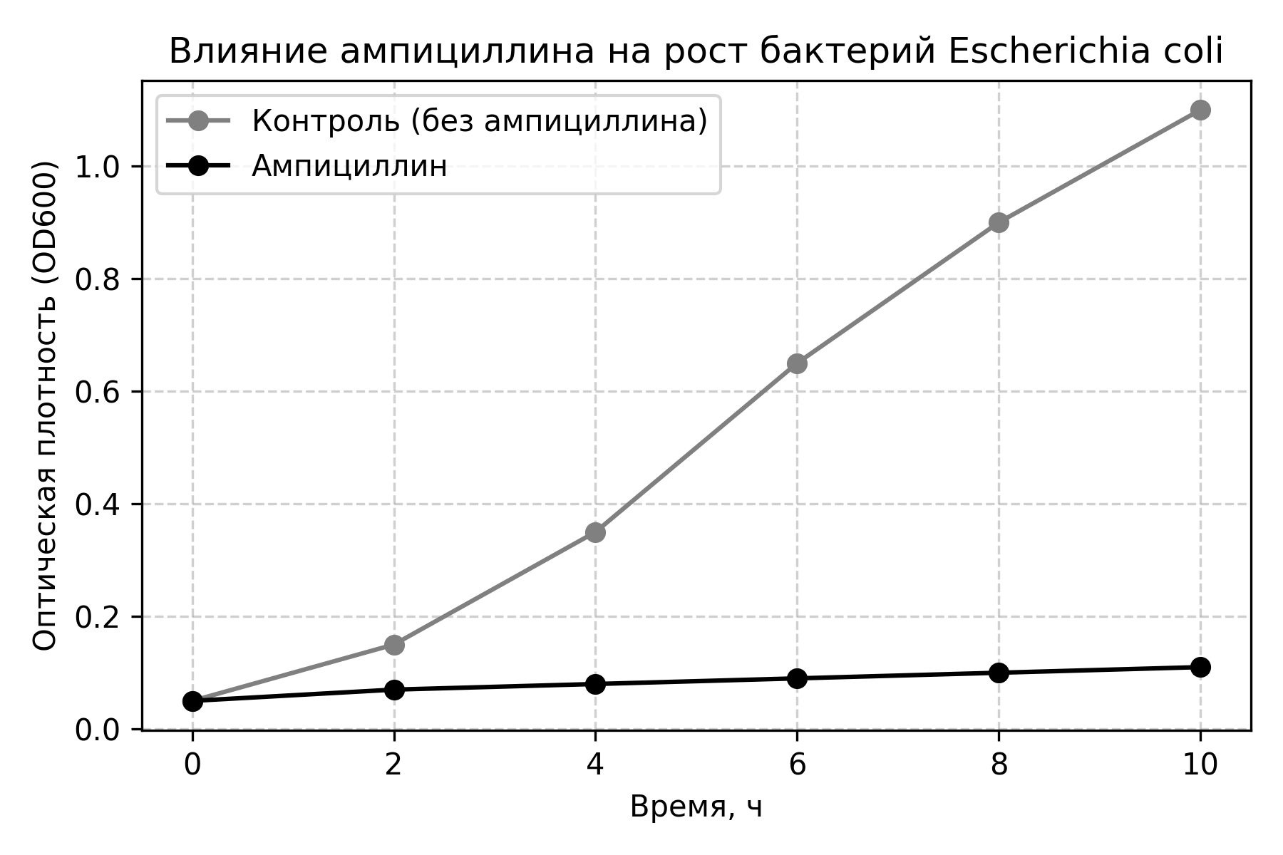 Экспериментатор изучал влияние антибиотика ампициллина на рост бактерий Escherichia coli. Для этого он измерял оптическую плотность бактериальной культуры в питательной среде LB при добавлении ампициллина или без него. Результаты представлены на диаграмме, где по оси Y — оптическая плотность (OD600), по оси X — время инкубации в часах, с кривыми для контроля и ампициллина.