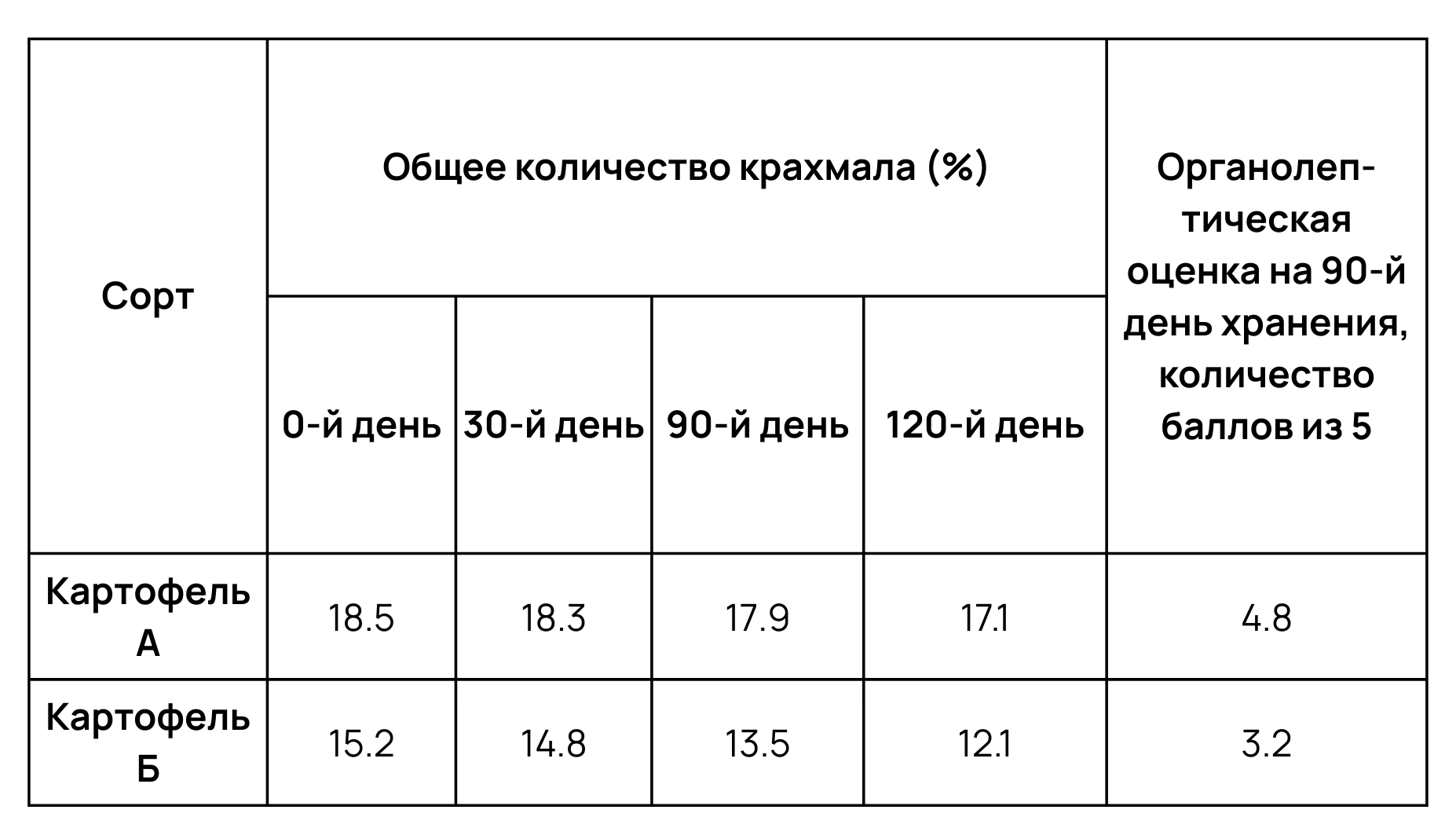 Экспериментатор изучал биохимические процессы, протекающие в клубнях картофеля сортов А и Б при длительном хранении. Результаты приведены в таблице.