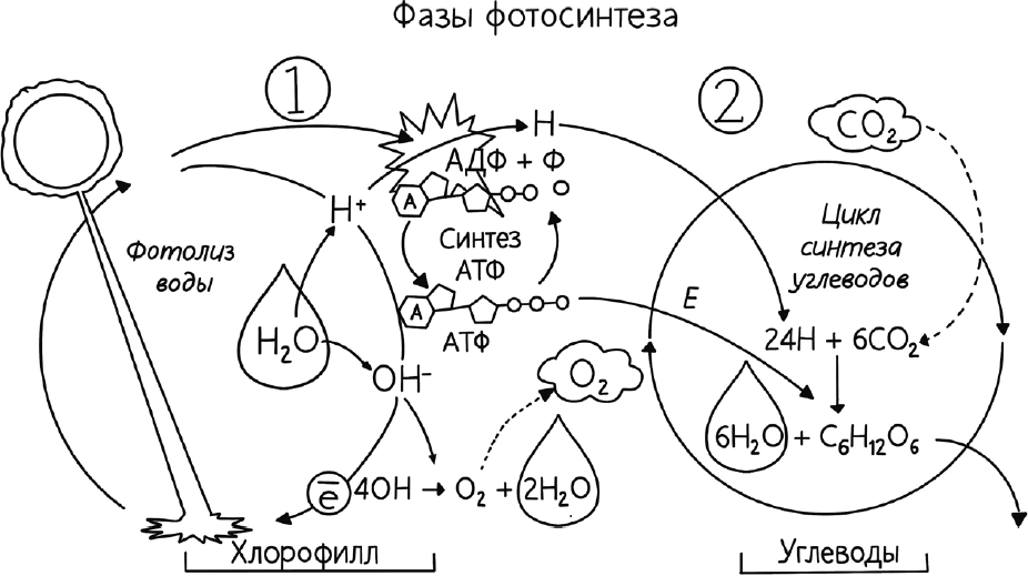 Какие этапы процесса фотосинтеза изображены на схеме под цифрами 1 и 2, при каких условиях и где они протекают? Какова роль воды в процессе фотосинтеза? Ответ поясните.