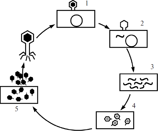 На рисунке представлено размножение бактериофага. Бактериофаги - это вирусы, атакующие бактерий. Под цифрами: