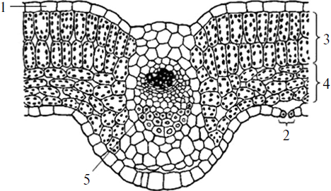 1 - кожица, 2 - устьице, 3 - столбчатая, 4 - губчатая фотосинтезирующая ткань (хлоренхима), 5 - жилка (содержит флоэму, ксилему и механические ткани)