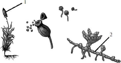 1 — коробочка со спорами, образуется из зиготы; 2 — протонема на поздних стадиях ИЛИ предросток, образуется в результате прорастания споры