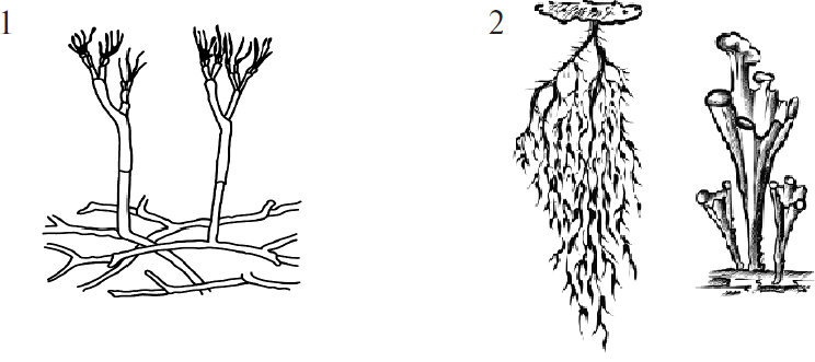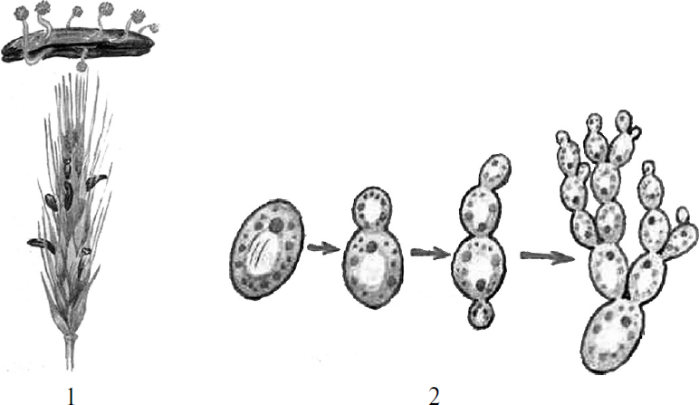 На рисунке 1 изображены грибы мукор и спорынья. Мукор относится к плесневым грибам. Их отличительной особенностью является отсутствие крупных плодовых тел, характерных для шляпочных грибов. Плесневые грибы обычно поселяются на органических субстратах (пищевых продуктах, древесине) и питаются за их счет, разлагая органику. При этом они могут вырабатывать различные вещества как полезные, так и опасные для человека. На рисунке 2 изображены дрожжи. Дрожжи — это грибы, чьи клетки имеют микроскопические размеры (около 5 мкм) и почкуются, образуя подобие колоний. Питание дрожжевых клеток в основном осуществляется сбраживанием низкомолекулярных углеводов (сахаров). Сахара сбраживаются дрожжами до спирта и углекислого газа. При этом выделяется энергия, идущая на процессы жизнедеятельности дрожжей. Человек научился использовать дрожжи еще в древности. Отмечено их использование в древнем Египте. Однако то, что это микроскопические грибы обеспечивают поднятие теста или образование спирта, люди тогда не знали.