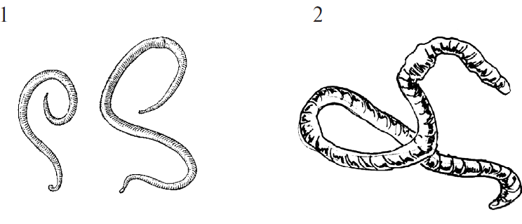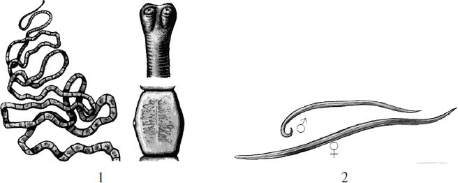 На первом рисунке изображен бычий цепень. Он гермафродит, т.е. особь, имеет мужские и женские половые органы. Тело цепня лентовидное. Для размножения цепню необходимо сменить хозяина. Циста цепня с водой и едой попадает в тело коровы, там развивается. При плохой прожарке мяса циста попадает в организм человека и там паразитирует. На втором рисунке изображена аскарида. Самцы аскариды меньше по размерам, чем самки. В среднем размер аскариды достигает 40 см. У них есть органы размножения (особи разнополые), пищеварительная система. Характерно "самозаражение", смена хозяина не требуется.