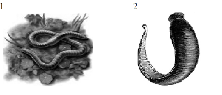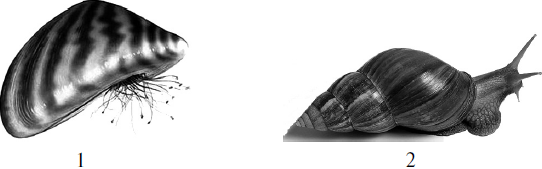 Цифрой 1 обозначен двухстворчатый моллюск. Двустворчатые моллюски являются фильтраторами. Питаются планктоном и взвешенными в воде органическими частичками. При этом происходит очищение воды. Характерной чертой является наличие достаточно большой раковины, состоящей из двух створок (что и дало название классу), охватывающих тело с боков. У двустворчатых моллюсков полностью редуцирована голова, у многих видов нет и ноги. Если нога есть (например, у беззубок), то служит для передвижения. При этом нога высовывается, прикрепляется к грунту, после чего к ней подтягивается раковина с туловищем животного. Органы дыхания — пластинчатые жабры, находящиеся под мантией справа и слева от тела моллюска. Цифрой 2 обозначен брюхоногий моллюск. Большинство Брюхоногих моллюсков имеют спирально закрученную раковину. В ротовой полости брюхоногих моллюсков находится мускулистый язык с хитиновыми зубами, образующими «тёрку» (или радулу). У растительноядных моллюсков тёрка (радула) служит для соскабливания растительной пищи, у хищных — помогает удерживать добычу. Моллюски размножаются только половым путём. Прудовики, катушки, слизни — гермафродиты. Оплодотворённые яйца они обычно откладывают на листья растений и различные водные предметы или между комочками почвы. Из яиц выходят маленькие улитки. Значит развитие прямое.