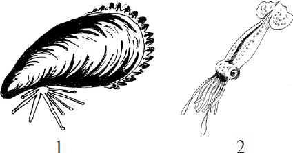 1 - двустворчатый моллюск, 2 - головоногие моллюск. У двустворчатых моллюсков есть фильтрующий аппарат.