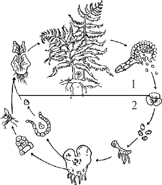 На схеме под цифрой 1 показано бесполое диплоидное поколение папоротника, которое образует споры путём мейоза, а под цифрой 2 показано гаплоидное половое поколение, которое образует гаметы (половые клетки) путём митоза. В половом поколении на заростке развиваются антеридии и архегонии, в которых образуются гаметы и оплодотворение обязательно происходит в присутствии капельножидкой влаги.