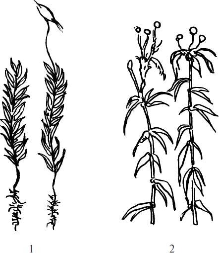 Под цифрой 1 нарисован мох кукушкин лён. Под цифрой 2 - мох сфагнум