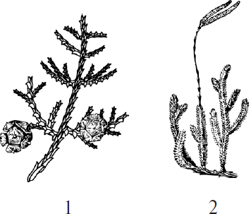 Под цифрой 1 ветвь голосеменного растения (можем понять это по наличию шишек). Под цифрой 2 плаун (это понятно по ползучим стелющимся побегам и стробилам - спороносным колоскам).