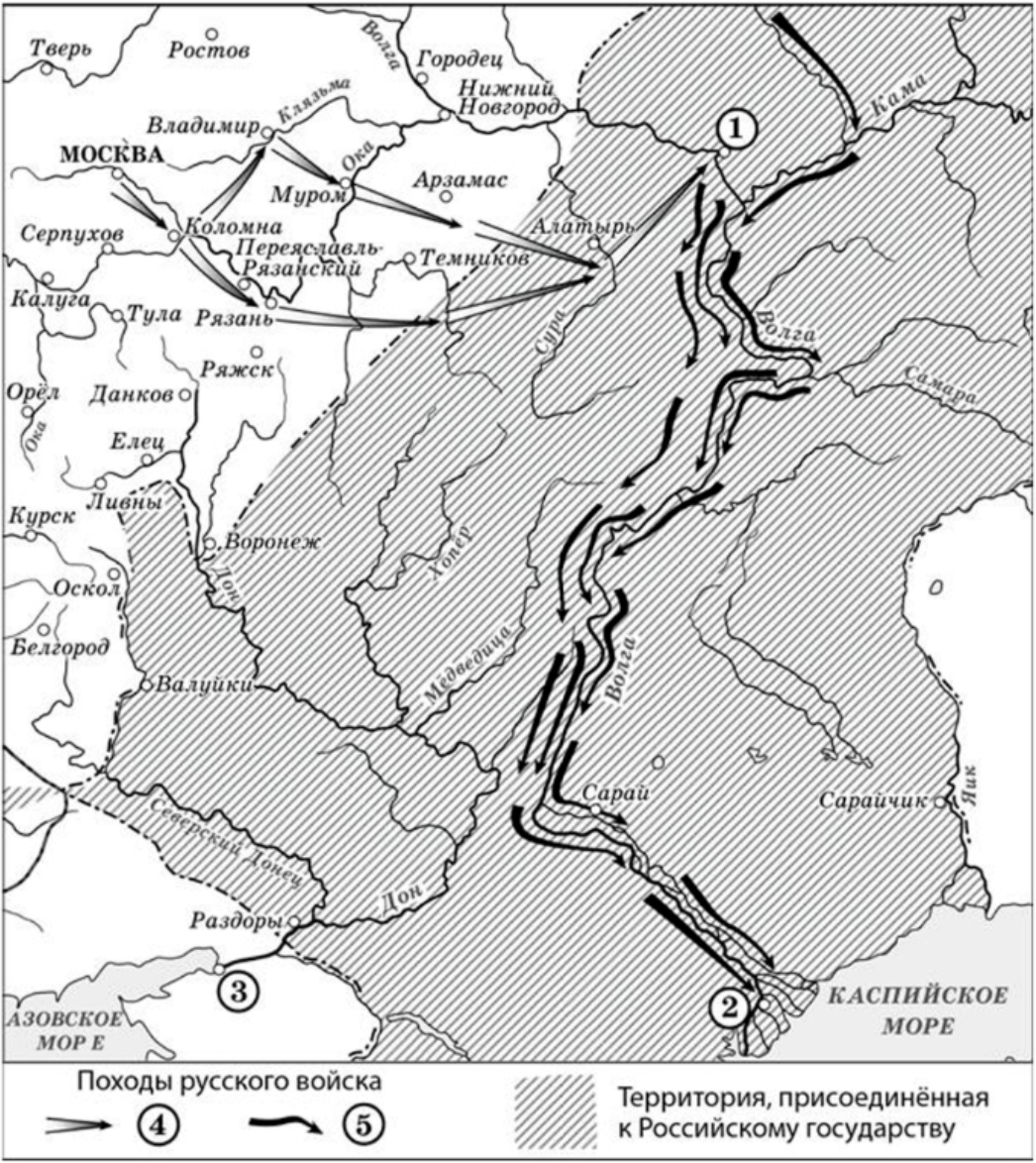 Цифрой «4» в легенде схемы обозначены серые стрелки, которые берут начало в городе Москве и направляются в город, расположенный в верховьях реки Волги. Понимаем, что это город Казань (так как вся карта посвящена походам царя Ивана Грозного). Казань была взята Иваном Грозным в 1552 году, но так как нас просят написать ответ словом (словосочетанием), то есть закончить предложение в задании, ответ будет: «пятьдесят втором».