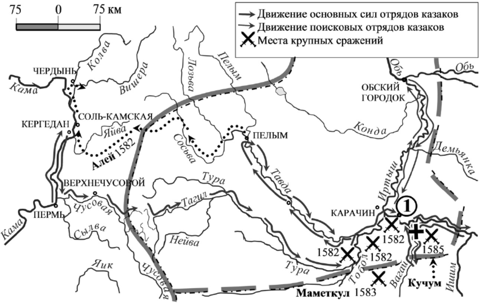 Внимательно посмотрим на карту (схему). Видим, что на ней отражен поход казаков, направленный в город Кашлык. Из курса истории вспоминаем, что Кашлык - это столица Сибирского ханства, походы на которое проходили в 1580-е годы в царствование Ивана Грозного. Данный поход возглавил казачий атаман - Ермак Тимофеевич.
