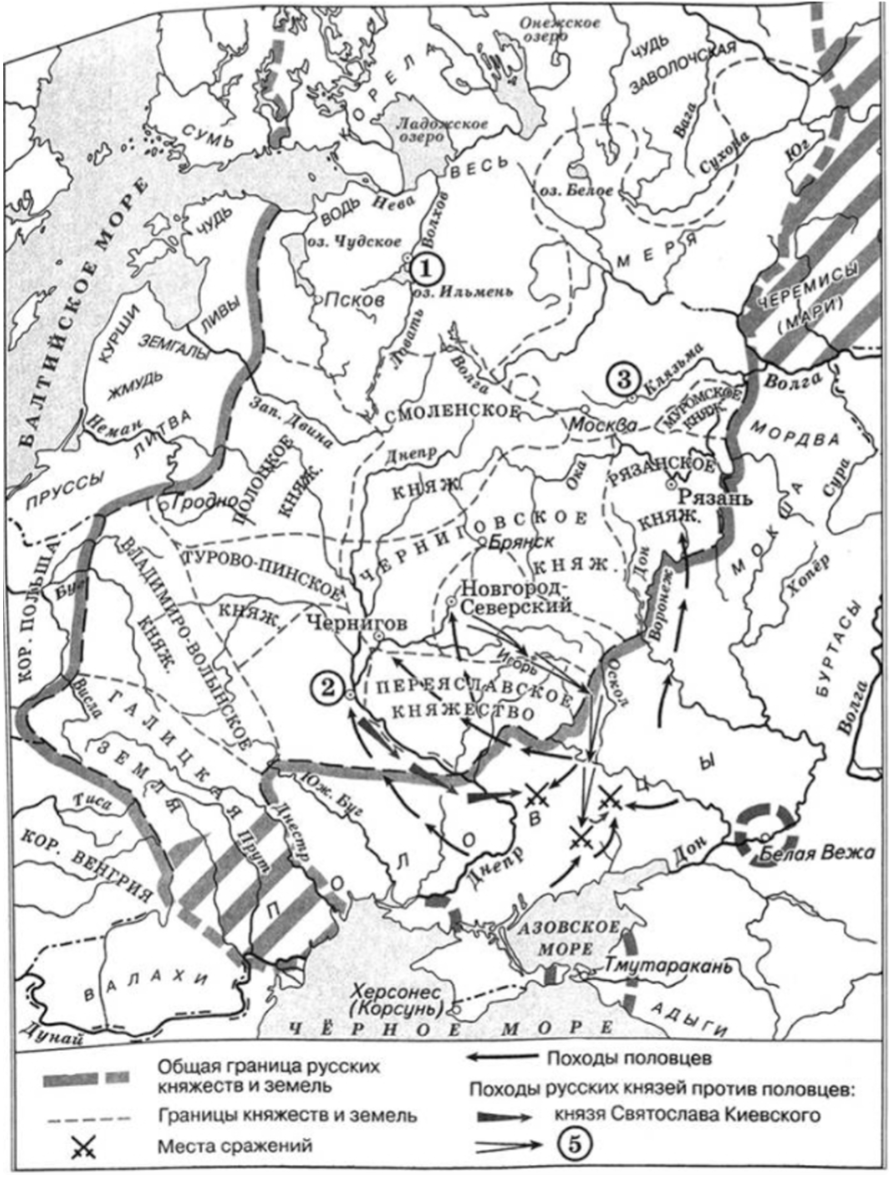 Внимательно рассмотрим карту. Она посвящена периоду политической раздробленности на Руси, так как в легенде схемы указано на границы княжеств и земель, то есть мы видим, что территория страны разделена на отдельные «куски», что как раз таки характерно для раздробленности. Далее по описанию текста мы видим, что нам нужно найти название реки, от берегов которой наступал хан Кочак. Действие этого хана прямо подписаны на карте и по ней видно, что стрелка идёт со стороны реки Дон. Именно поэтому она и будет являться верным ответом.