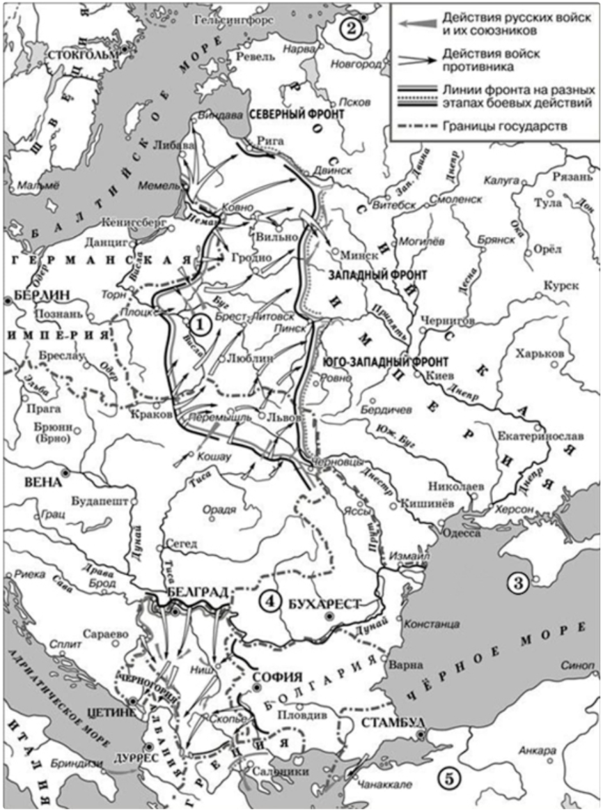«Длительное наступление противника лишило русскую армию тех территориальных приобретений, которых удалось достигнуть в прошлом году. В первую очередь, это коснулось Галиции с городами Львов и Перемышль. По итогу кампании линию фронта удалось стабилизировать. На Юго-Западном фронте она прошла по городам Черновцы и Ровно, а на Северном - по реке Западная Двина с городами Двинск и ____________ .»