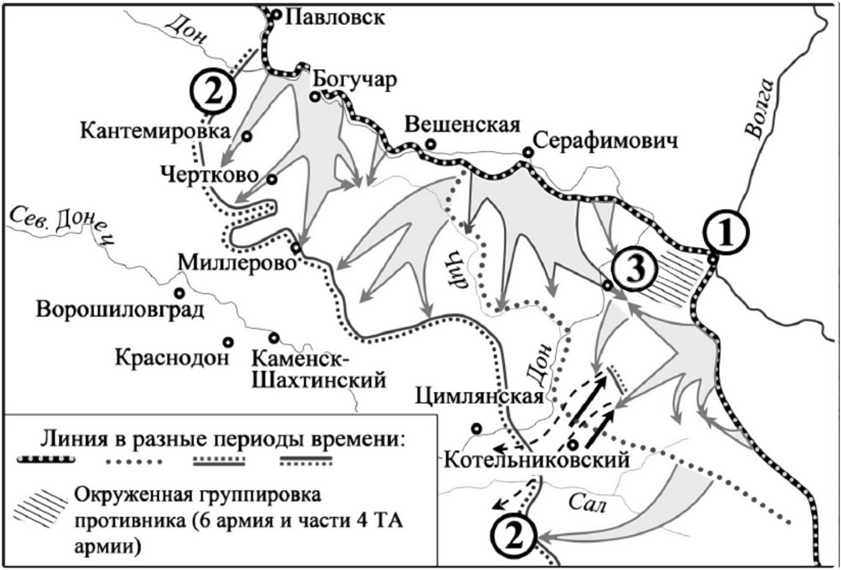 Накануне контрнаступления весь Юго-Западный и Донской фронты держались на таких ключевых опорных пунктах, как Павловск, Богучар, Вешенская и _______________. Когда начались наступательные действия Красной Армии под _______________, советские войска в короткий срок сумели оттеснить немцев на линию реки Чир, которая является притоком Дона.