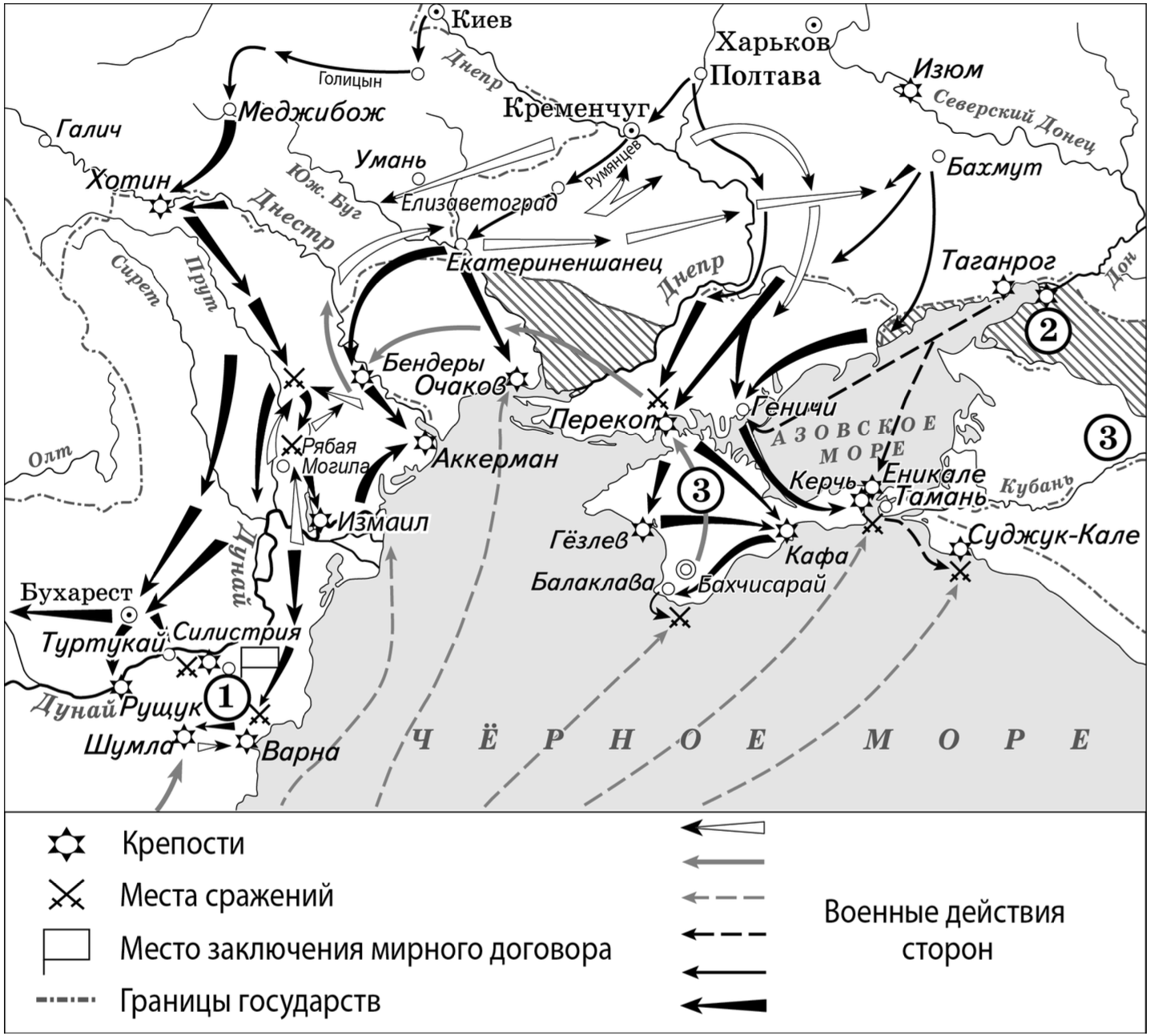 Внимательно рассмотрим карту и найдем на ней движение войск Румянцева от Кременчуга. Это вниз по Днепру от Киева. Далее найдем Елизаветоград и Екатериненшанец. В нём происходит разделение войск Румянцева. Часть идет на Очаков, а другая часть - на Бендеры и Аккерман. В тексте сказано, что крепость находится вверх по Днестру к северу от Аккермана. Значит, ответ - Бендеры.
