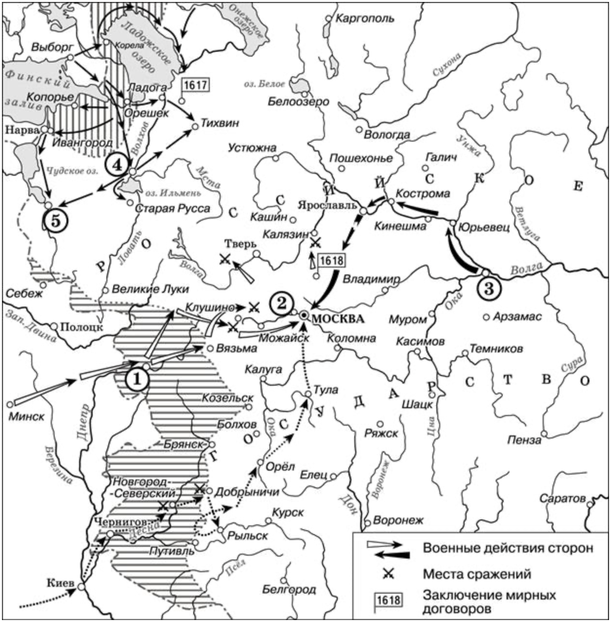 На схеме изображены события Смутного времени. Найди на карте упомянутые в тексте задания города и населённые пункты. Посмотри, что происходит со стрелкой у Добрыничей, Рыльска и Путивля. Далее видим, как стрелка после Рыльска и Путивля направляется в сторону город Орёл.