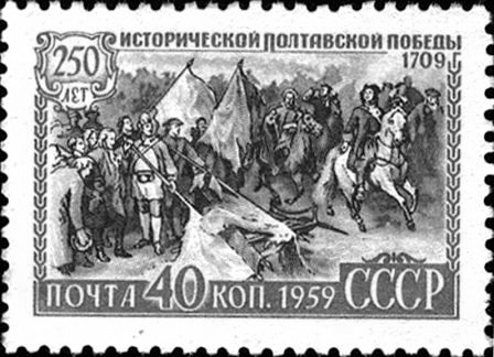 Так как марка посвящена Полтавской битве 1709 года, то нам нужно выбрать такие сооружения, которые были воздвигнуты в XVIII веке. На 1 картинке изображена здание ГУМ в Москве - это конец XIX века. На 2 картине изображено здание Кунсткамеры в Санкт-Петербурге, основанное в первой половине XVIII века. На 3 картинке изображен царь-колокол, расположенный в Московском кремле и отлитый по указу императрицы Анны Иоанновны в XVIII веке. Ну и на 4 картинке изображена скульптура известного советского скульптора Е. Вучетича, она расположена в Нью-Йорке и называется "Перекуём мечи на орала". Следовательно, верный ответ будет 23.