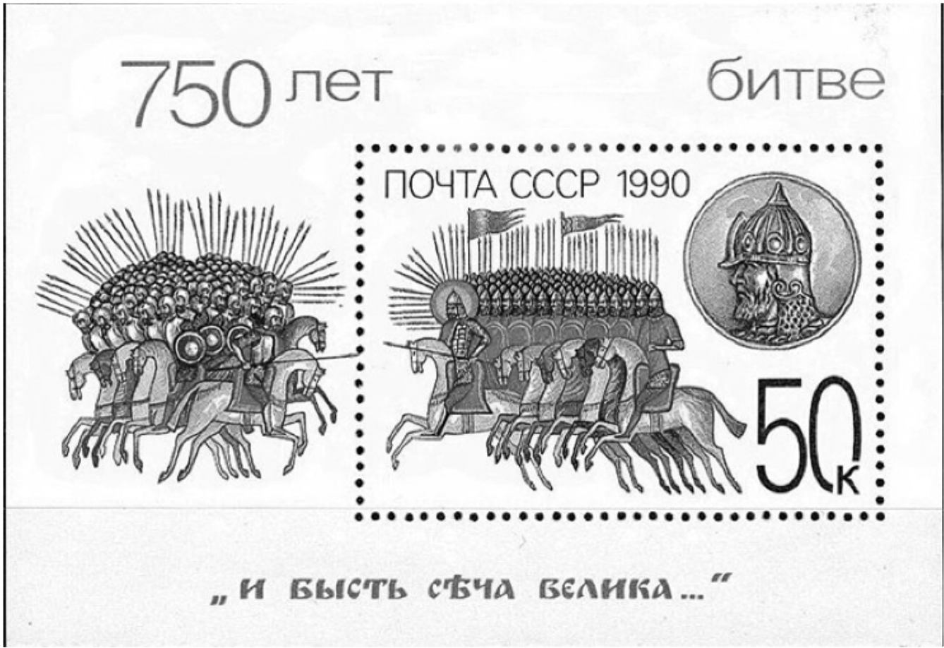 Какая из представленных ниже памятных монет была выпущена к юбилею события, празднование которого произошло в период руководства СССР того же исторического деятеля, при котором была выпущена данная марка? В ответе запишите цифру, которой обозначена эта монета. Назовите правителя России, при котором произошло событие, отраженное на данной монете.