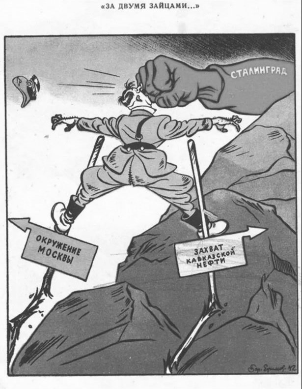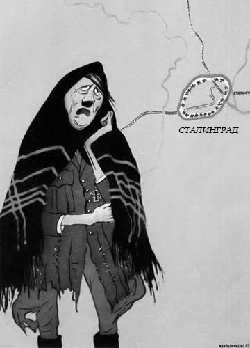 На 1 карикатуре изображены события, связанные с курской дугой – это не Сталинградская битва, а Курская битва 1943 года. На 2 карикатуре изображены события Сталинградской битвы (город Сталинград написан на рукаве). 3 карикатура посвящена снятию блокады Ленинграда в 1944 году, ну и 4 карикатура – это тоже Сталинградская битва (она изображает окружение в кольцо 6-й армии фельдмаршала Паулюса). Таким образом, полный ответ - 24 (так как другие карикатуры посвящены другим битвам).