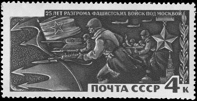 Видим, что данная данная марка посвящена 25-летию разгрома фашистских войск под Москвой. Разгром началась в ходе контрнаступление красной армии в декабре 1941 года. Ответь будет - "сорок первом".