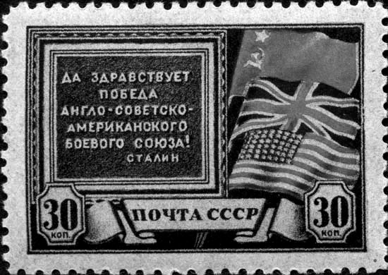 На данной марке видим флаги трёх государств — СССР, Великобритании и США, кроме того, имеется фраза Сталина, подсказывающая, что речь про «антигитлеровскую коалицию». Первая встреча лидеров коалиции произошла в г. Тегеране в 1943 году. В ответ пишем — «сорок третьем».