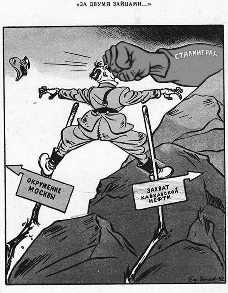 На данном карикатурном плакате мы видим, как образ Гитлера пытается "угнаться за двумя зайцами" (так называется плакат, его название указано сверху) по направлением к Москве и захвату кавказской нефти, но получает удар рукой, которая именуется Сталинградом. Следовательно, плакат посвящен операции Уран, когда началось контрнаступление советских войск под Сталинградом.
