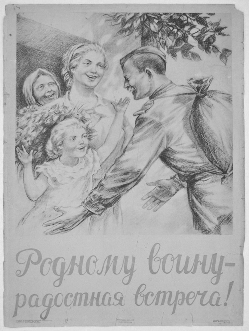 На плакате мы видим надписать "Родному войну - радостная встреча!" Тут включаем логику и думаем, в каком году могли радостно встречать война с фронтов Великой Отечественной войны. Само собой - это конец войны, то есть 1945 год.