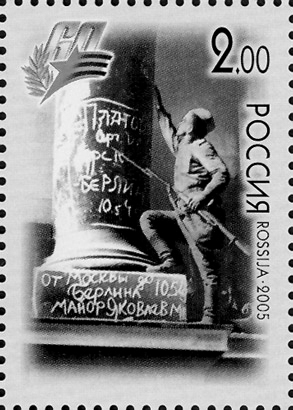 На марке мы видим, как советский солдат пишет на колонне информацию, посвященную Берлину; фразу: "от Москвы до Берлина" - все это дает понять, что речь про Берлинскую операцию и раз солдат пишет на колонне фразы (он явно это делает не в боевых условиях), то логично, что речь про МАЙ месяц, так как в мае закончилась Берлинская операция и Великая Отечественная война соответственно.
