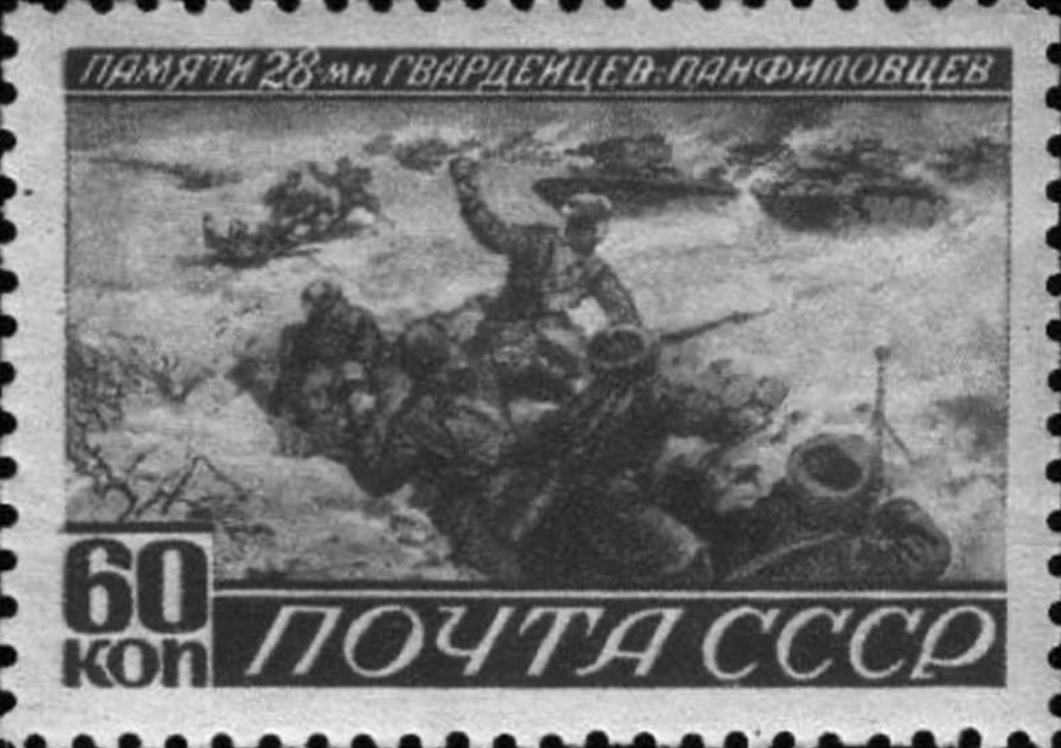 Данная марка посвящена подвигу 28 бойцов из дивизии генерала Панфилова, которые в ноябре 1941 года при обороне Москвы у разъезда Дубосеково вступили в неравный бой с преобладающими силами противника.
