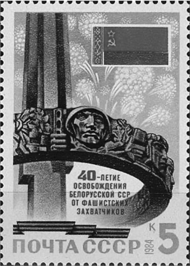 Данная марка посвящена 40-летию освобождения Белорусской ССР от фашистских захватчиков. Беларусь была освобождена в ходе пятого сталинского удара, а именно — операции «Багратион», проводившейся летом 1944 года. Следовательно, правильный ответ — 1944 год.